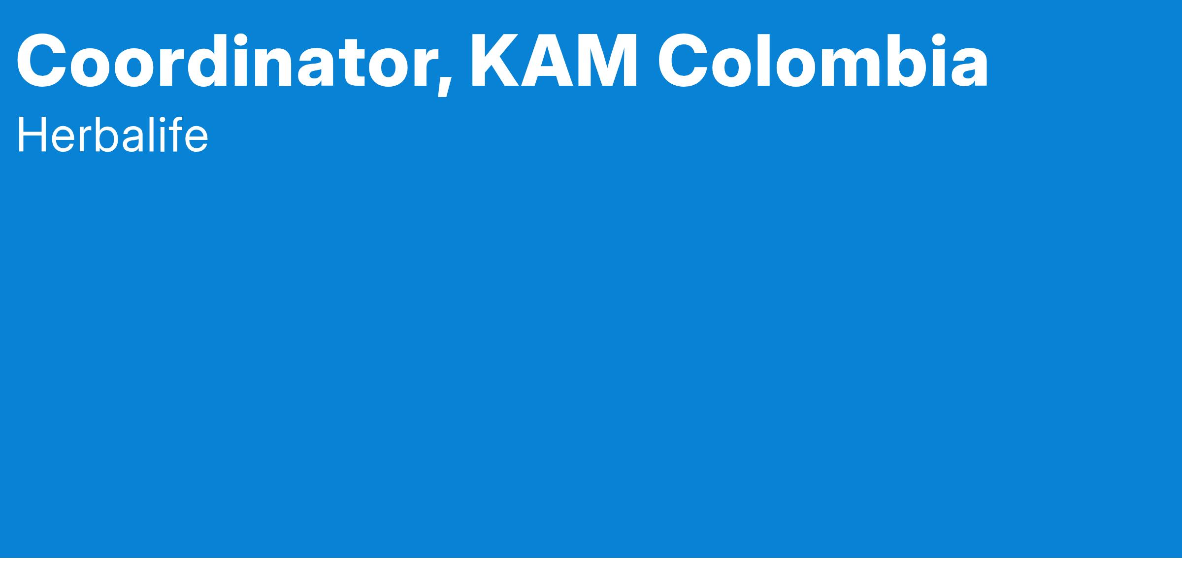 El Coordinador Regional KAM es responsable de lograr resultados a través de terceros; ofrece a los Distribuidores su conocimiento sobre el plan de ventas del negocio independiente de Herbalife, estrategias corporativas y está en la capacidad de analizar información relevante, con el fin de acompañarlo en la construcción de planes de trabajo, generando crecimiento en el negocio personal del Distribuidor y su organización, logrando impactar la venta del país.